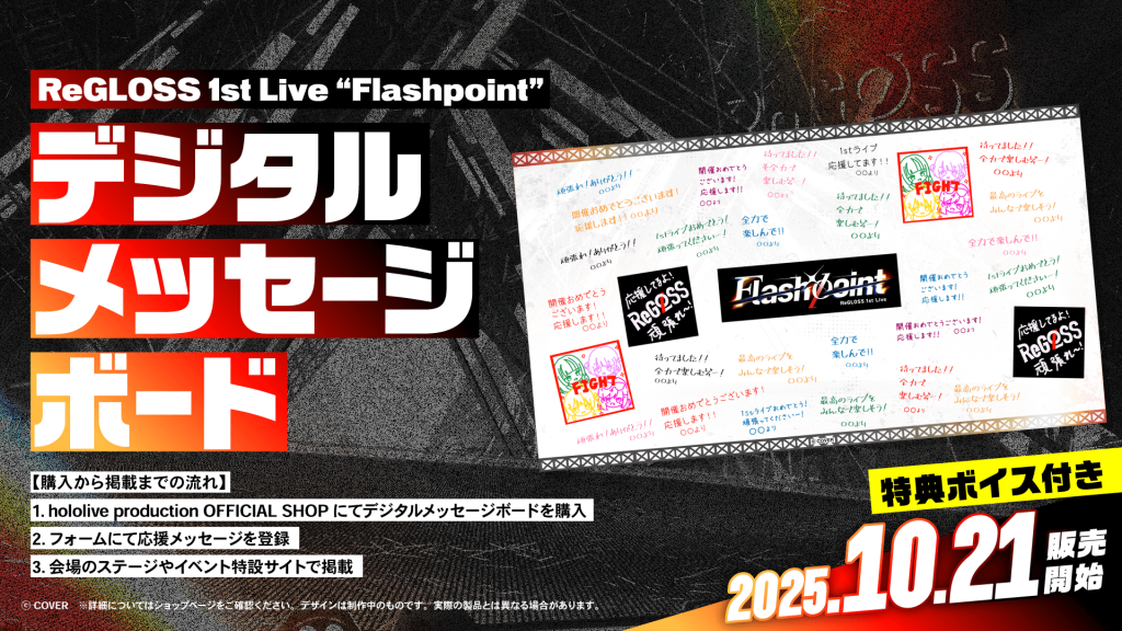 2025年12月16日に開催される、ReGLOSS 1st Live “Flashpoint”に出演するタレントへ向けて応援メッセージをお贈りいただくことができる、デジタルメッセージボードの販売を開始しました!
